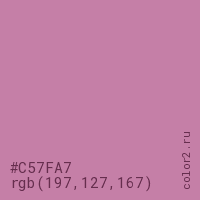 Цвет #C57FA7 в цветовой модели RGB обозначается тремя октетами (197, 127, 167) в десятичном формате и #C57FA7 в шестнадцатиричном (hex) формате, которые являются интенсивностью красного 197 (hex C5), интенсивность зелёного 127 (hex 7F) и интенсивность синего 167 (hex A7).