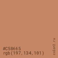 Цвет #C58665 в цветовой модели RGB обозначается тремя октетами (197, 134, 101) в десятичном формате и #C58665 в шестнадцатиричном (hex) формате, которые являются интенсивностью красного 197 (hex C5), интенсивность зелёного 134 (hex 86) и интенсивность синего 101 (hex 65).