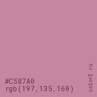 Цвет #C587A0 в цветовой модели RGB обозначается тремя октетами (197, 135, 160) в десятичном формате и #C587A0 в шестнадцатиричном (hex) формате, которые являются интенсивностью красного 197 (hex C5), интенсивность зелёного 135 (hex 87) и интенсивность синего 160 (hex A0).