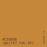 Цвет #C5883B в цветовой модели RGB обозначается тремя октетами (197, 136, 59) в десятичном формате и #C5883B в шестнадцатиричном (hex) формате, которые являются интенсивностью красного 197 (hex C5), интенсивность зелёного 136 (hex 88) и интенсивность синего 59 (hex 3B).