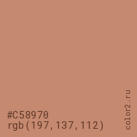 Цвет #C58970 в цветовой модели RGB обозначается тремя октетами (197, 137, 112) в десятичном формате и #C58970 в шестнадцатиричном (hex) формате, которые являются интенсивностью красного 197 (hex C5), интенсивность зелёного 137 (hex 89) и интенсивность синего 112 (hex 70).