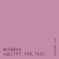 Цвет #C58AA5 в цветовой модели RGB обозначается тремя октетами (197, 138, 165) в десятичном формате и #C58AA5 в шестнадцатиричном (hex) формате, которые являются интенсивностью красного 197 (hex C5), интенсивность зелёного 138 (hex 8A) и интенсивность синего 165 (hex A5).