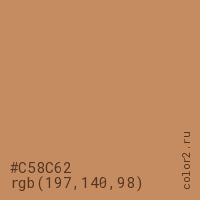 Цвет #C58C62 в цветовой модели RGB обозначается тремя октетами (197, 140, 98) в десятичном формате и #C58C62 в шестнадцатиричном (hex) формате, которые являются интенсивностью красного 197 (hex C5), интенсивность зелёного 140 (hex 8C) и интенсивность синего 98 (hex 62).