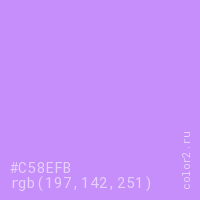 Цвет #C58EFB в цветовой модели RGB обозначается тремя октетами (197, 142, 251) в десятичном формате и #C58EFB в шестнадцатиричном (hex) формате, которые являются интенсивностью красного 197 (hex C5), интенсивность зелёного 142 (hex 8E) и интенсивность синего 251 (hex FB).