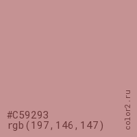 Цвет #C59293 в цветовой модели RGB обозначается тремя октетами (197, 146, 147) в десятичном формате и #C59293 в шестнадцатиричном (hex) формате, которые являются интенсивностью красного 197 (hex C5), интенсивность зелёного 146 (hex 92) и интенсивность синего 147 (hex 93).