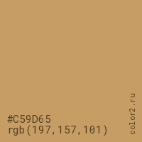 Цвет #C59D65 в цветовой модели RGB обозначается тремя октетами (197, 157, 101) в десятичном формате и #C59D65 в шестнадцатиричном (hex) формате, которые являются интенсивностью красного 197 (hex C5), интенсивность зелёного 157 (hex 9D) и интенсивность синего 101 (hex 65).