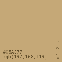 Цвет #C5A877 в цветовой модели RGB обозначается тремя октетами (197, 168, 119) в десятичном формате и #C5A877 в шестнадцатиричном (hex) формате, которые являются интенсивностью красного 197 (hex C5), интенсивность зелёного 168 (hex A8) и интенсивность синего 119 (hex 77).