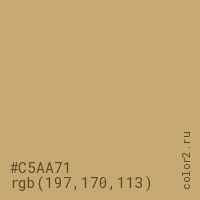 Цвет #C5AA71 в цветовой модели RGB обозначается тремя октетами (197, 170, 113) в десятичном формате и #C5AA71 в шестнадцатиричном (hex) формате, которые являются интенсивностью красного 197 (hex C5), интенсивность зелёного 170 (hex AA) и интенсивность синего 113 (hex 71).