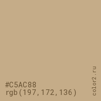 Цвет #C5AC88 в цветовой модели RGB обозначается тремя октетами (197, 172, 136) в десятичном формате и #C5AC88 в шестнадцатиричном (hex) формате, которые являются интенсивностью красного 197 (hex C5), интенсивность зелёного 172 (hex AC) и интенсивность синего 136 (hex 88).