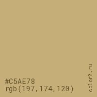 Цвет #C5AE78 в цветовой модели RGB обозначается тремя октетами (197, 174, 120) в десятичном формате и #C5AE78 в шестнадцатиричном (hex) формате, которые являются интенсивностью красного 197 (hex C5), интенсивность зелёного 174 (hex AE) и интенсивность синего 120 (hex 78).