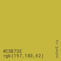 Цвет #C5B73E в цветовой модели RGB обозначается тремя октетами (197, 183, 62) в десятичном формате и #C5B73E в шестнадцатиричном (hex) формате, которые являются интенсивностью красного 197 (hex C5), интенсивность зелёного 183 (hex B7) и интенсивность синего 62 (hex 3E).