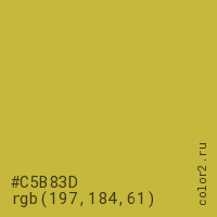 Цвет #C5B83D в цветовой модели RGB обозначается тремя октетами (197, 184, 61) в десятичном формате и #C5B83D в шестнадцатиричном (hex) формате, которые являются интенсивностью красного 197 (hex C5), интенсивность зелёного 184 (hex B8) и интенсивность синего 61 (hex 3D).