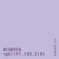 Цвет #C5B9DA в цветовой модели RGB обозначается тремя октетами (197, 185, 218) в десятичном формате и #C5B9DA в шестнадцатиричном (hex) формате, которые являются интенсивностью красного 197 (hex C5), интенсивность зелёного 185 (hex B9) и интенсивность синего 218 (hex DA).