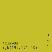 Цвет #C5BF2B в цветовой модели RGB обозначается тремя октетами (197, 191, 43) в десятичном формате и #C5BF2B в шестнадцатиричном (hex) формате, которые являются интенсивностью красного 197 (hex C5), интенсивность зелёного 191 (hex BF) и интенсивность синего 43 (hex 2B).