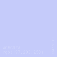 Цвет RGB(197, 203, 250) в процентом отношении количества цвета состоит из 77.3% красного (red), 79.6% зелёного (green) и 98% синего (blue).