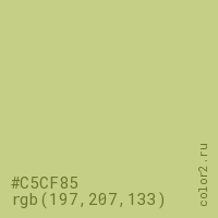 Цвет #C5CF85 в цветовой модели RGB обозначается тремя октетами (197, 207, 133) в десятичном формате и #C5CF85 в шестнадцатиричном (hex) формате, которые являются интенсивностью красного 197 (hex C5), интенсивность зелёного 207 (hex CF) и интенсивность синего 133 (hex 85).