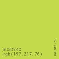 Цвет #C5D94C в цветовой модели RGB обозначается тремя октетами (197, 217, 76) в десятичном формате и #C5D94C в шестнадцатиричном (hex) формате, которые являются интенсивностью красного 197 (hex C5), интенсивность зелёного 217 (hex D9) и интенсивность синего 76 (hex 4C).