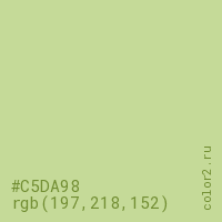 Цвет #C5DA98 в цветовой модели RGB обозначается тремя октетами (197, 218, 152) в десятичном формате и #C5DA98 в шестнадцатиричном (hex) формате, которые являются интенсивностью красного 197 (hex C5), интенсивность зелёного 218 (hex DA) и интенсивность синего 152 (hex 98).