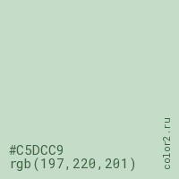 Цвет #C5DCC9 в цветовой модели RGB обозначается тремя октетами (197, 220, 201) в десятичном формате и #C5DCC9 в шестнадцатиричном (hex) формате, которые являются интенсивностью красного 197 (hex C5), интенсивность зелёного 220 (hex DC) и интенсивность синего 201 (hex C9).