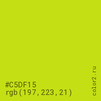 Цвет #C5DF15 в цветовой модели RGB обозначается тремя октетами (197, 223, 21) в десятичном формате и #C5DF15 в шестнадцатиричном (hex) формате, которые являются интенсивностью красного 197 (hex C5), интенсивность зелёного 223 (hex DF) и интенсивность синего 21 (hex 15).
