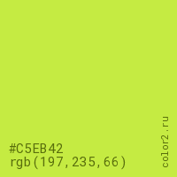 Цвет #C5EB42 в цветовой модели RGB обозначается тремя октетами (197, 235, 66) в десятичном формате и #C5EB42 в шестнадцатиричном (hex) формате, которые являются интенсивностью красного 197 (hex C5), интенсивность зелёного 235 (hex EB) и интенсивность синего 66 (hex 42).