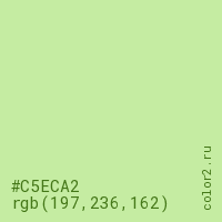 Цвет #C5ECA2 в цветовой модели RGB обозначается тремя октетами (197, 236, 162) в десятичном формате и #C5ECA2 в шестнадцатиричном (hex) формате, которые являются интенсивностью красного 197 (hex C5), интенсивность зелёного 236 (hex EC) и интенсивность синего 162 (hex A2).