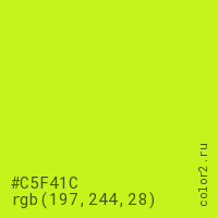 Цвет #C5F41C в цветовой модели RGB обозначается тремя октетами (197, 244, 28) в десятичном формате и #C5F41C в шестнадцатиричном (hex) формате, которые являются интенсивностью красного 197 (hex C5), интенсивность зелёного 244 (hex F4) и интенсивность синего 28 (hex 1C).