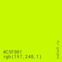 Цвет #C5F801 в цветовой модели RGB обозначается тремя октетами (197, 248, 1) в десятичном формате и #C5F801 в шестнадцатиричном (hex) формате, которые являются интенсивностью красного 197 (hex C5), интенсивность зелёного 248 (hex F8) и интенсивность синего 1 (hex 01).
