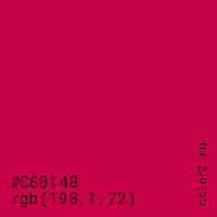 Цвет #C60148 в цветовой модели RGB обозначается тремя октетами (198, 1, 72) в десятичном формате и #C60148 в шестнадцатиричном (hex) формате, которые являются интенсивностью красного 198 (hex C6), интенсивность зелёного 1 (hex 01) и интенсивность синего 72 (hex 48).