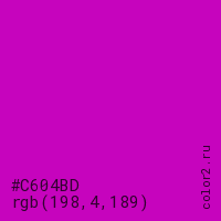 Цвет #C604BD в цветовой модели RGB обозначается тремя октетами (198, 4, 189) в десятичном формате и #C604BD в шестнадцатиричном (hex) формате, которые являются интенсивностью красного 198 (hex C6), интенсивность зелёного 4 (hex 04) и интенсивность синего 189 (hex BD).