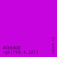 Цвет #C604DD в цветовой модели RGB обозначается тремя октетами (198, 4, 221) в десятичном формате и #C604DD в шестнадцатиричном (hex) формате, которые являются интенсивностью красного 198 (hex C6), интенсивность зелёного 4 (hex 04) и интенсивность синего 221 (hex DD).