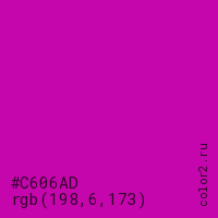 Цвет #C606AD в цветовой модели RGB обозначается тремя октетами (198, 6, 173) в десятичном формате и #C606AD в шестнадцатиричном (hex) формате, которые являются интенсивностью красного 198 (hex C6), интенсивность зелёного 6 (hex 06) и интенсивность синего 173 (hex AD).
