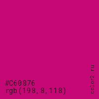 Цвет #C60876 в цветовой модели RGB обозначается тремя октетами (198, 8, 118) в десятичном формате и #C60876 в шестнадцатиричном (hex) формате, которые являются интенсивностью красного 198 (hex C6), интенсивность зелёного 8 (hex 08) и интенсивность синего 118 (hex 76).