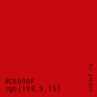 Цвет #C6090F в цветовой модели RGB обозначается тремя октетами (198, 9, 15) в десятичном формате и #C6090F в шестнадцатиричном (hex) формате, которые являются интенсивностью красного 198 (hex C6), интенсивность зелёного 9 (hex 09) и интенсивность синего 15 (hex 0F).