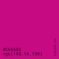 Цвет #C60A82 в цветовой модели RGB обозначается тремя октетами (198, 10, 130) в десятичном формате и #C60A82 в шестнадцатиричном (hex) формате, которые являются интенсивностью красного 198 (hex C6), интенсивность зелёного 10 (hex 0A) и интенсивность синего 130 (hex 82).