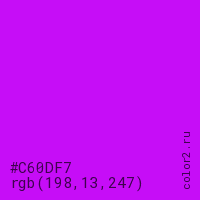 Цвет #C60DF7 в цветовой модели RGB обозначается тремя октетами (198, 13, 247) в десятичном формате и #C60DF7 в шестнадцатиричном (hex) формате, которые являются интенсивностью красного 198 (hex C6), интенсивность зелёного 13 (hex 0D) и интенсивность синего 247 (hex F7).