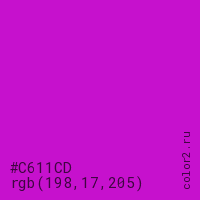 Цвет #C611CD в цветовой модели RGB обозначается тремя октетами (198, 17, 205) в десятичном формате и #C611CD в шестнадцатиричном (hex) формате, которые являются интенсивностью красного 198 (hex C6), интенсивность зелёного 17 (hex 11) и интенсивность синего 205 (hex CD).