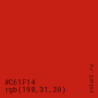 Цвет #C61F14 в цветовой модели RGB обозначается тремя октетами (198, 31, 20) в десятичном формате и #C61F14 в шестнадцатиричном (hex) формате, которые являются интенсивностью красного 198 (hex C6), интенсивность зелёного 31 (hex 1F) и интенсивность синего 20 (hex 14).