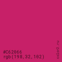 Цвет #C62066 в цветовой модели RGB обозначается тремя октетами (198, 32, 102) в десятичном формате и #C62066 в шестнадцатиричном (hex) формате, которые являются интенсивностью красного 198 (hex C6), интенсивность зелёного 32 (hex 20) и интенсивность синего 102 (hex 66).