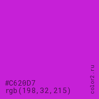 Цвет #C620D7 в цветовой модели RGB обозначается тремя октетами (198, 32, 215) в десятичном формате и #C620D7 в шестнадцатиричном (hex) формате, которые являются интенсивностью красного 198 (hex C6), интенсивность зелёного 32 (hex 20) и интенсивность синего 215 (hex D7).
