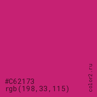 Цвет #C62173 в цветовой модели RGB обозначается тремя октетами (198, 33, 115) в десятичном формате и #C62173 в шестнадцатиричном (hex) формате, которые являются интенсивностью красного 198 (hex C6), интенсивность зелёного 33 (hex 21) и интенсивность синего 115 (hex 73).