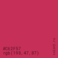 Цвет #C62F57 в цветовой модели RGB обозначается тремя октетами (198, 47, 87) в десятичном формате и #C62F57 в шестнадцатиричном (hex) формате, которые являются интенсивностью красного 198 (hex C6), интенсивность зелёного 47 (hex 2F) и интенсивность синего 87 (hex 57).
