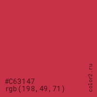 Цвет #C63147 в цветовой модели RGB обозначается тремя октетами (198, 49, 71) в десятичном формате и #C63147 в шестнадцатиричном (hex) формате, которые являются интенсивностью красного 198 (hex C6), интенсивность зелёного 49 (hex 31) и интенсивность синего 71 (hex 47).