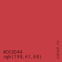 Цвет #C63D44 в цветовой модели RGB обозначается тремя октетами (198, 61, 68) в десятичном формате и #C63D44 в шестнадцатиричном (hex) формате, которые являются интенсивностью красного 198 (hex C6), интенсивность зелёного 61 (hex 3D) и интенсивность синего 68 (hex 44).