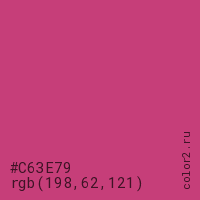 Цвет #C63E79 в цветовой модели RGB обозначается тремя октетами (198, 62, 121) в десятичном формате и #C63E79 в шестнадцатиричном (hex) формате, которые являются интенсивностью красного 198 (hex C6), интенсивность зелёного 62 (hex 3E) и интенсивность синего 121 (hex 79).