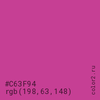 Цвет #C63F94 в цветовой модели RGB обозначается тремя октетами (198, 63, 148) в десятичном формате и #C63F94 в шестнадцатиричном (hex) формате, которые являются интенсивностью красного 198 (hex C6), интенсивность зелёного 63 (hex 3F) и интенсивность синего 148 (hex 94).