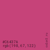 Цвет #C6437A в цветовой модели RGB обозначается тремя октетами (198, 67, 122) в десятичном формате и #C6437A в шестнадцатиричном (hex) формате, которые являются интенсивностью красного 198 (hex C6), интенсивность зелёного 67 (hex 43) и интенсивность синего 122 (hex 7A).