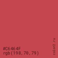 Цвет #C6464F в цветовой модели RGB обозначается тремя октетами (198, 70, 79) в десятичном формате и #C6464F в шестнадцатиричном (hex) формате, которые являются интенсивностью красного 198 (hex C6), интенсивность зелёного 70 (hex 46) и интенсивность синего 79 (hex 4F).