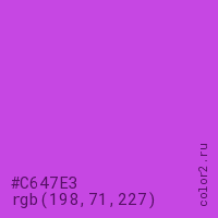 Цвет #C647E3 в цветовой модели RGB обозначается тремя октетами (198, 71, 227) в десятичном формате и #C647E3 в шестнадцатиричном (hex) формате, которые являются интенсивностью красного 198 (hex C6), интенсивность зелёного 71 (hex 47) и интенсивность синего 227 (hex E3).