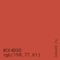 Цвет #C64D3D в цветовой модели RGB обозначается тремя октетами (198, 77, 61) в десятичном формате и #C64D3D в шестнадцатиричном (hex) формате, которые являются интенсивностью красного 198 (hex C6), интенсивность зелёного 77 (hex 4D) и интенсивность синего 61 (hex 3D).